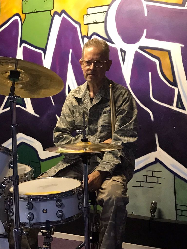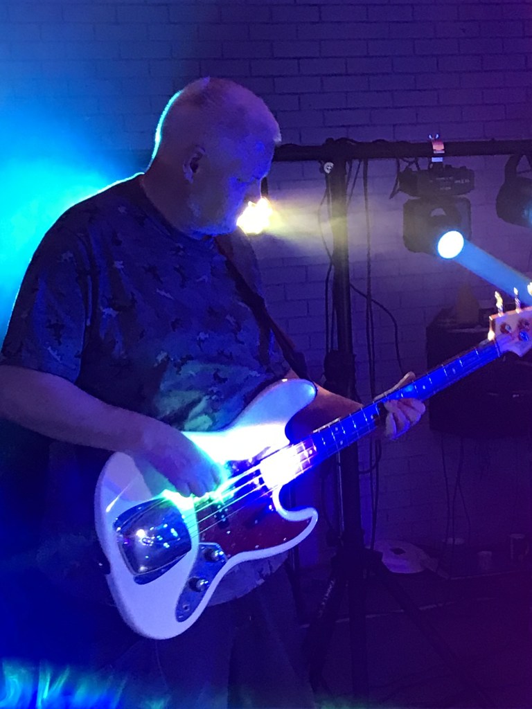 On the bass and backing vocals Mr Mike Pearson. Mike also plays guitar and piano and can make a song bop along nicely. He was once a member of Puzzle Factory (the puzzle is which one) and loves cereal. He once played a one note guitar solo.